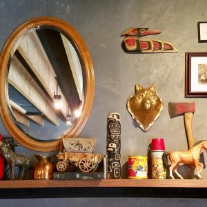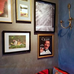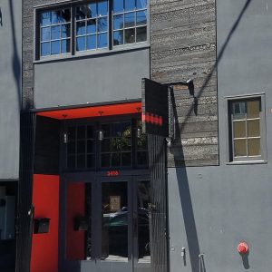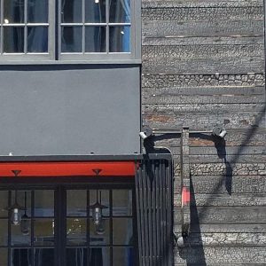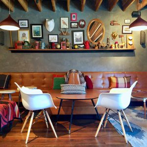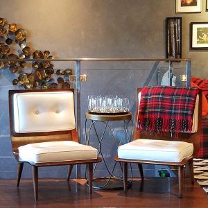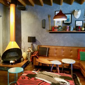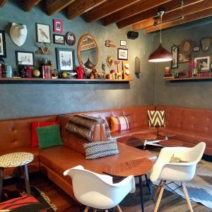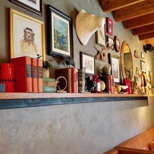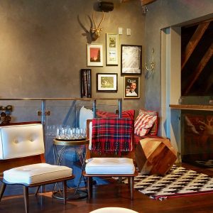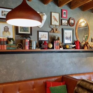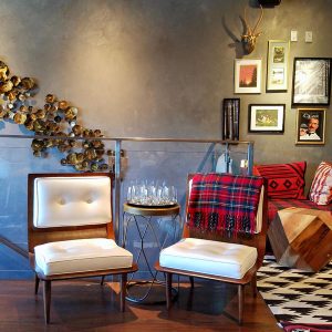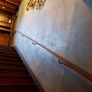This cozy restaurant space designed by Abueg Morris Architects of Berkeley, CA features a hand-applied wall finish that adds an industrial flair to mid-century inspired decor. The stairs leading to the mezzanine-level lounge are flanked by custom-dyed Graphite plaster topped with a mica-infused glaze that add sheen throughout the space. This finish highlights a beautiful sculptural wall element on the stairwell and gallery walls throughout this comfortable, welcoming eatery. Rich wood textures, wraparound leather banquettes, and touches of cabin whimsy are highlighted by the subtle texture of the walls in this comfortable lounge area overlooking the open restaurant below.
