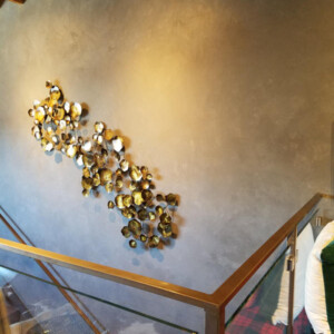 This cozy restaurant space designed by Abueg Morris Architects of Berkeley, CA features a hand-applied wall finish that adds an industrial flair to mid-century inspired decor. The stairs leading to the mezzanine-level lounge are flanked by custom-dyed Graphite plaster topped with a mica-infused glaze that add sheen throughout the space. This finish highlights a beautiful sculptural wall element on the stairwell and gallery walls throughout this comfortable, welcoming eatery. Rich wood textures, wraparound leather banquettes, and touches of cabin whimsy are highlighted by the subtle texture of the walls in this comfortable lounge area overlooking the open restaurant below.